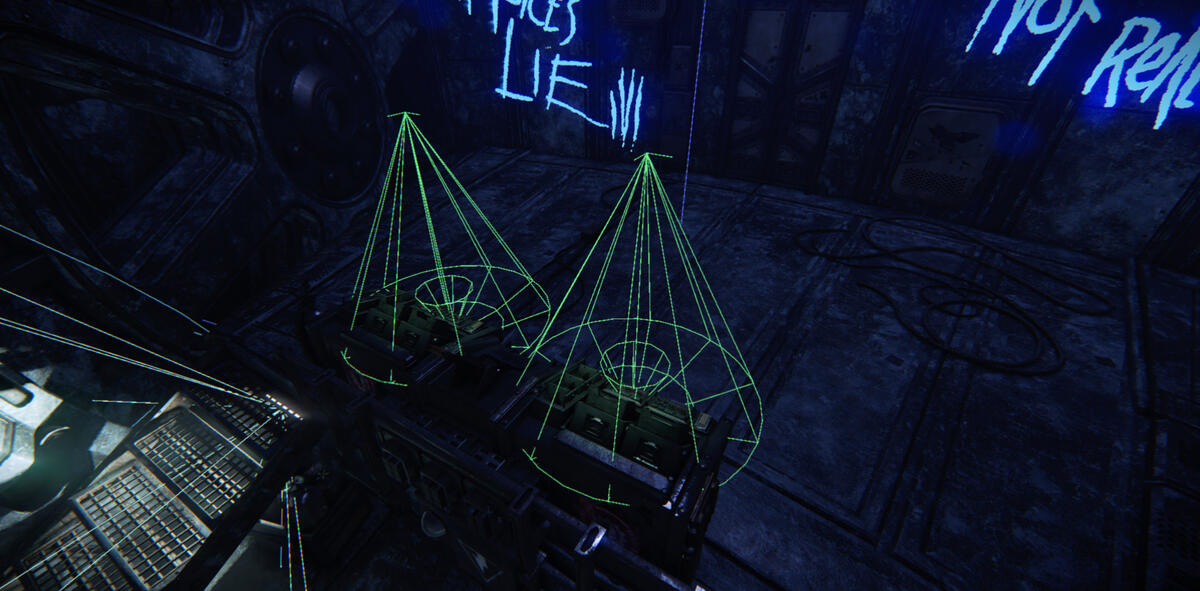 This is the end of the first part of the level. There was this massive wall that I felt needed something more than what the player had seen so far, so I added big spotlights from a higher point, lighting up the entire area.It is however the fixtures below that's making the light for the area, the spotlights cast light only a few meters for optimization.