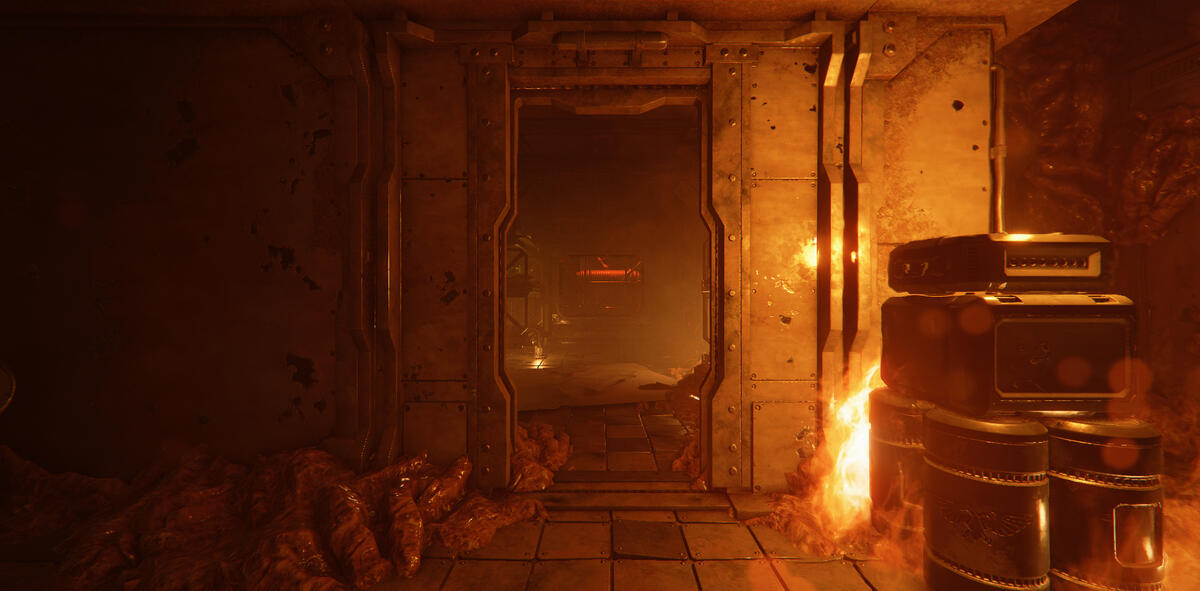 I wanted the door at the end of the level to have a different type of lighting setup than the rest, so I increased the volumetric fog and put a spotlight behind it to create a strong silhouette.