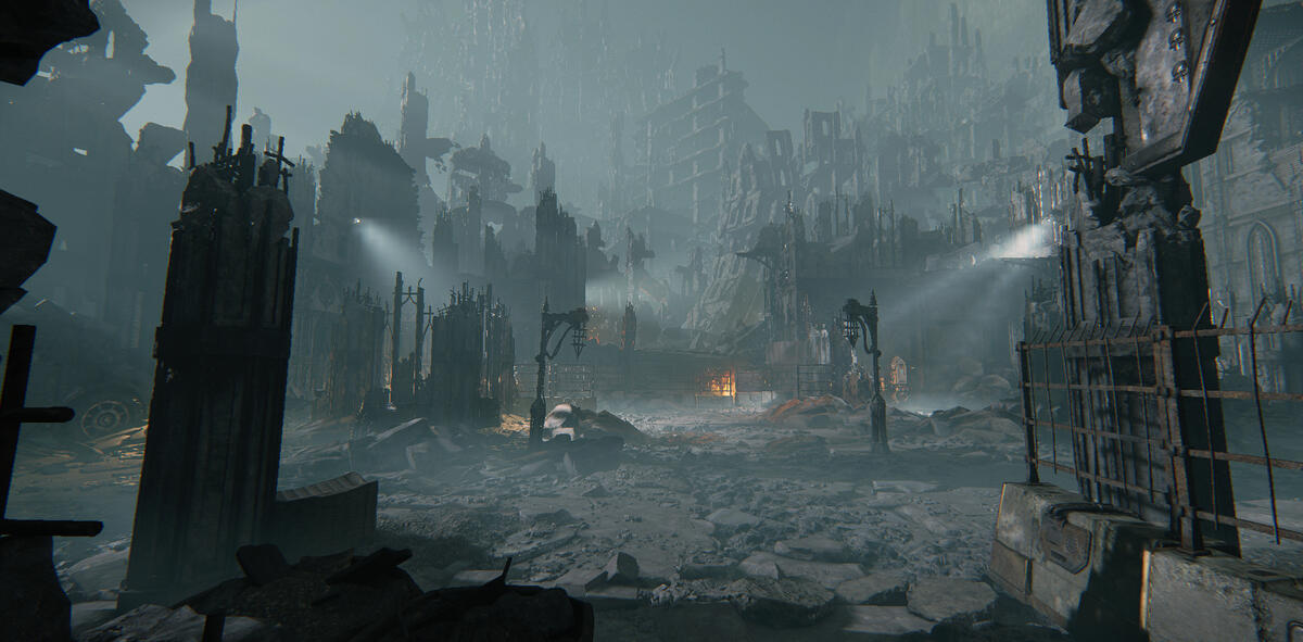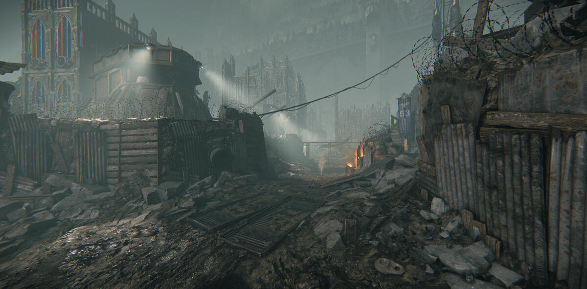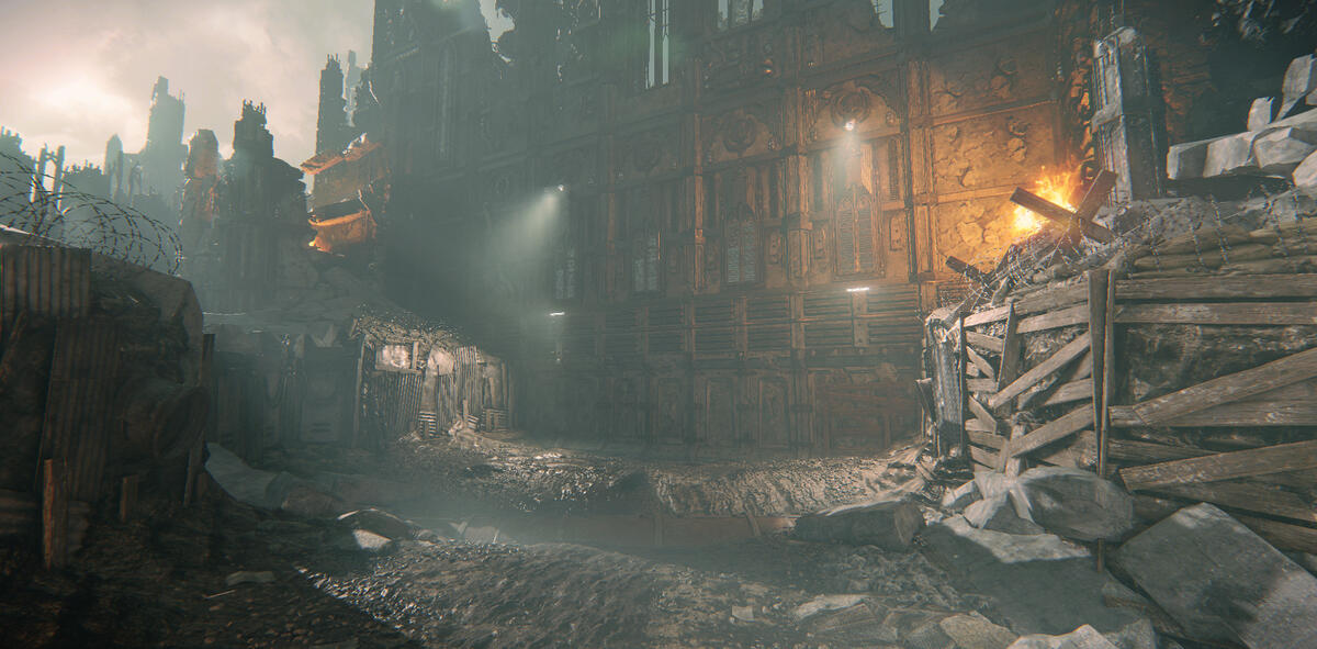 Since this is the area before a battle field, I wanted there to still be some fires here. This window created an opportunity to guide the player, and also create interesting shadows and fog rays.